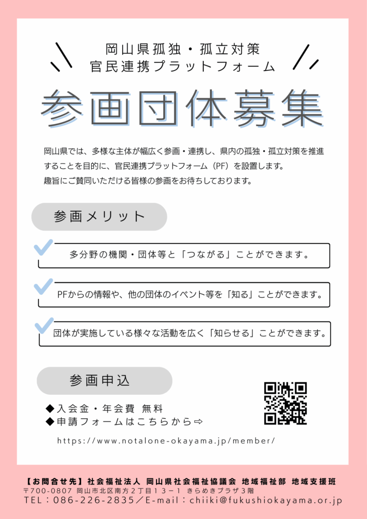 県では、行政やNPO、企業など様々な主体が連携・協働し、人と人との「つながり」を実感できる社会を目指す「岡山県孤独・孤立対策官民連携プラットフォーム」の設立にあたり、参画団体を募集しています。